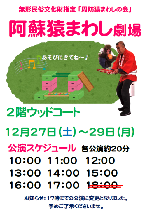公演時間変更のお知らせ:阿蘇猿まわし劇場がやってくる♪