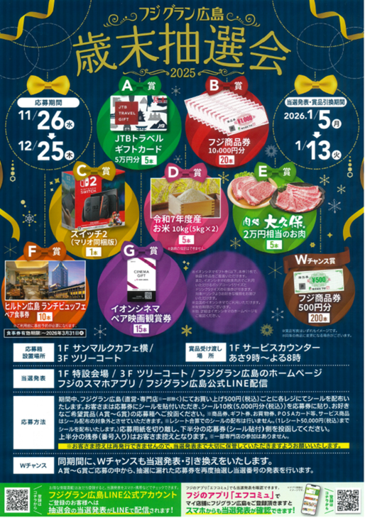 【当選発表】1F特設会場/3Fツリーコート/フジグラン広島のホームページ/フジのスマホアプリ/フジグラン広島公式LINE配信