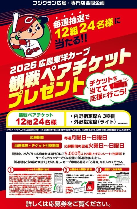 フジグラン広島の直営および専門店にて5,000円(税込)以上お買上げのレシート(何枚でも可)を『応募券』に添付し、『応募券』と『お客さま控え』を切り離し、カープ専用応募箱に『応募券』をお入れください。